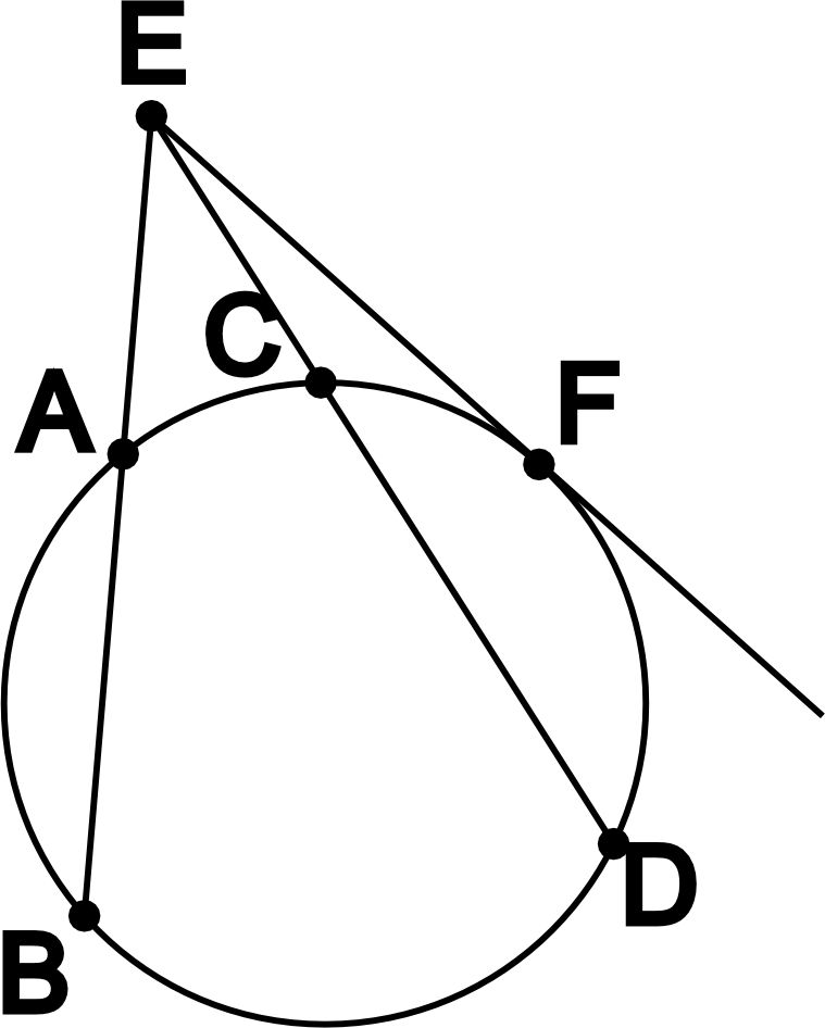 - Если секущая и касательная исходят из одной точки вне окружности, то произведение длин отрезков от этой точки до точек пересечения секущей с окружностью будет равно квадрату длины отрезка от исходной точки до точки касания касательной с окружностью.