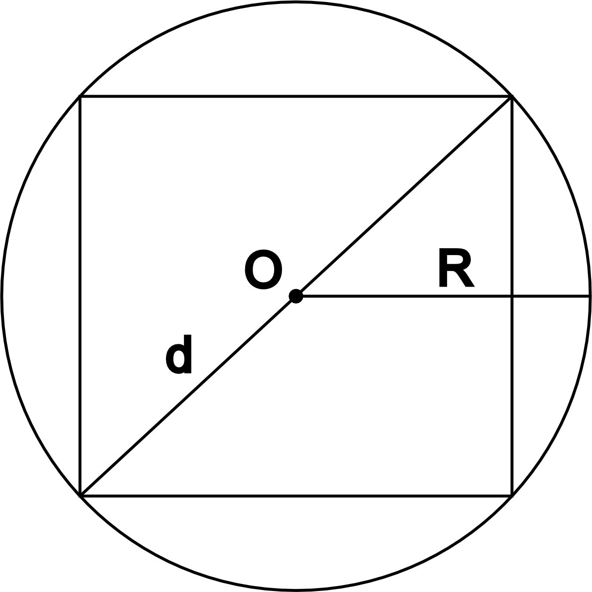 - Через диагональ вписанного прямоугольника. Вписанным называется прямоугольник, касающийся окружности всеми своими вершинами.
