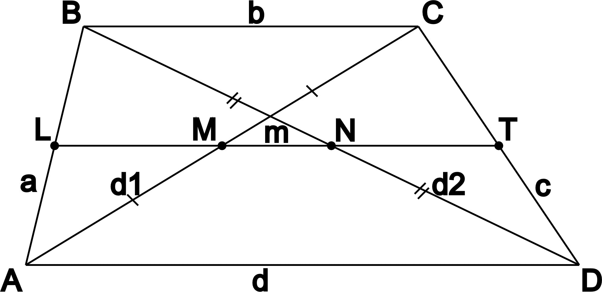 На рисунке d1 и d2 - диагонали трапеции, M и N - точки пересечения диагоналей со средней линией трапеции.
