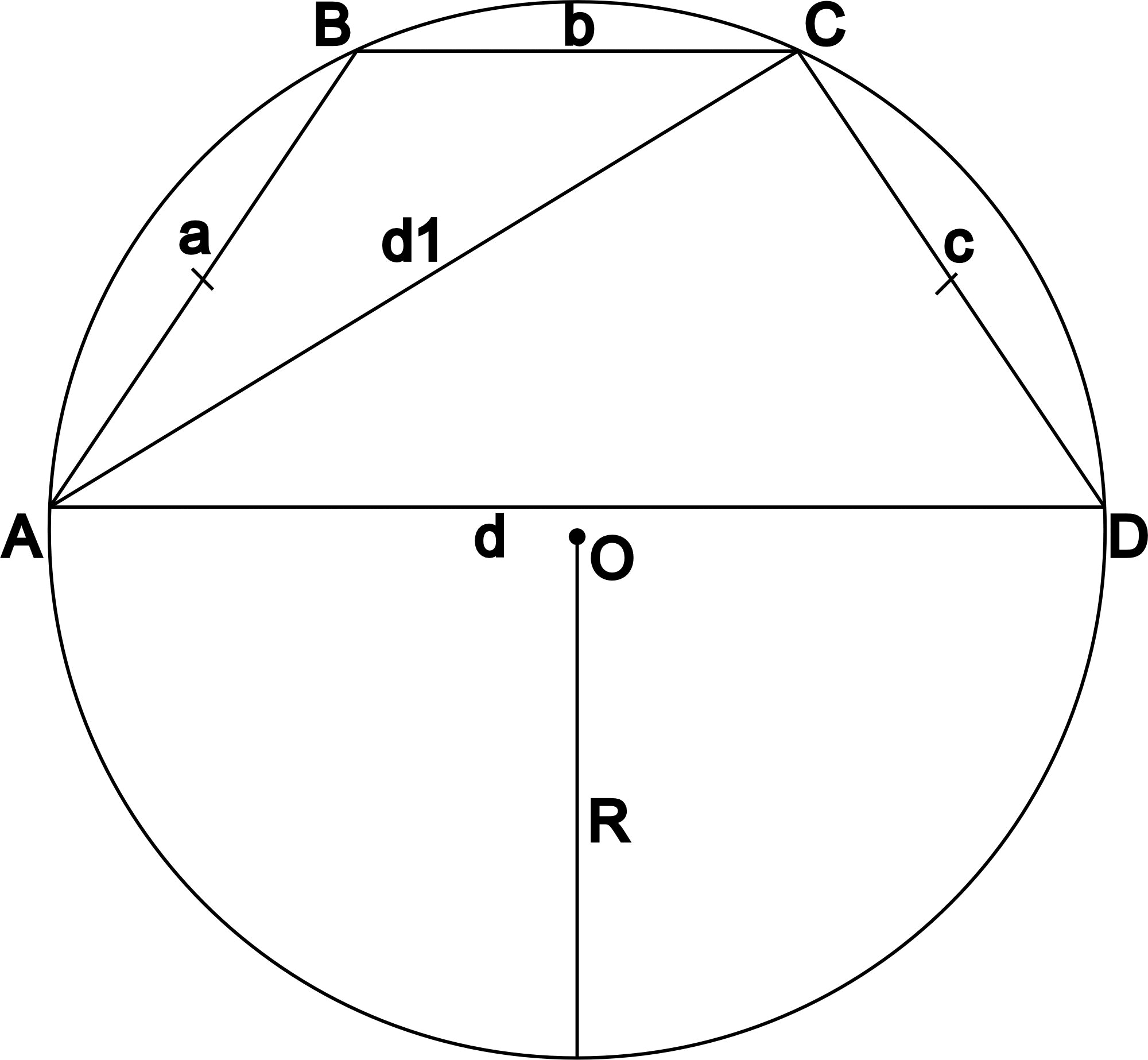 Окружностью описанной вокруг трапеции называется окружность, касающаяся всех вершин трапеции.Напомним, что описать окружность можно только вокруг равнобедренной трапеции. Таким образом приведённая ниже формула применима только в данном случае.
