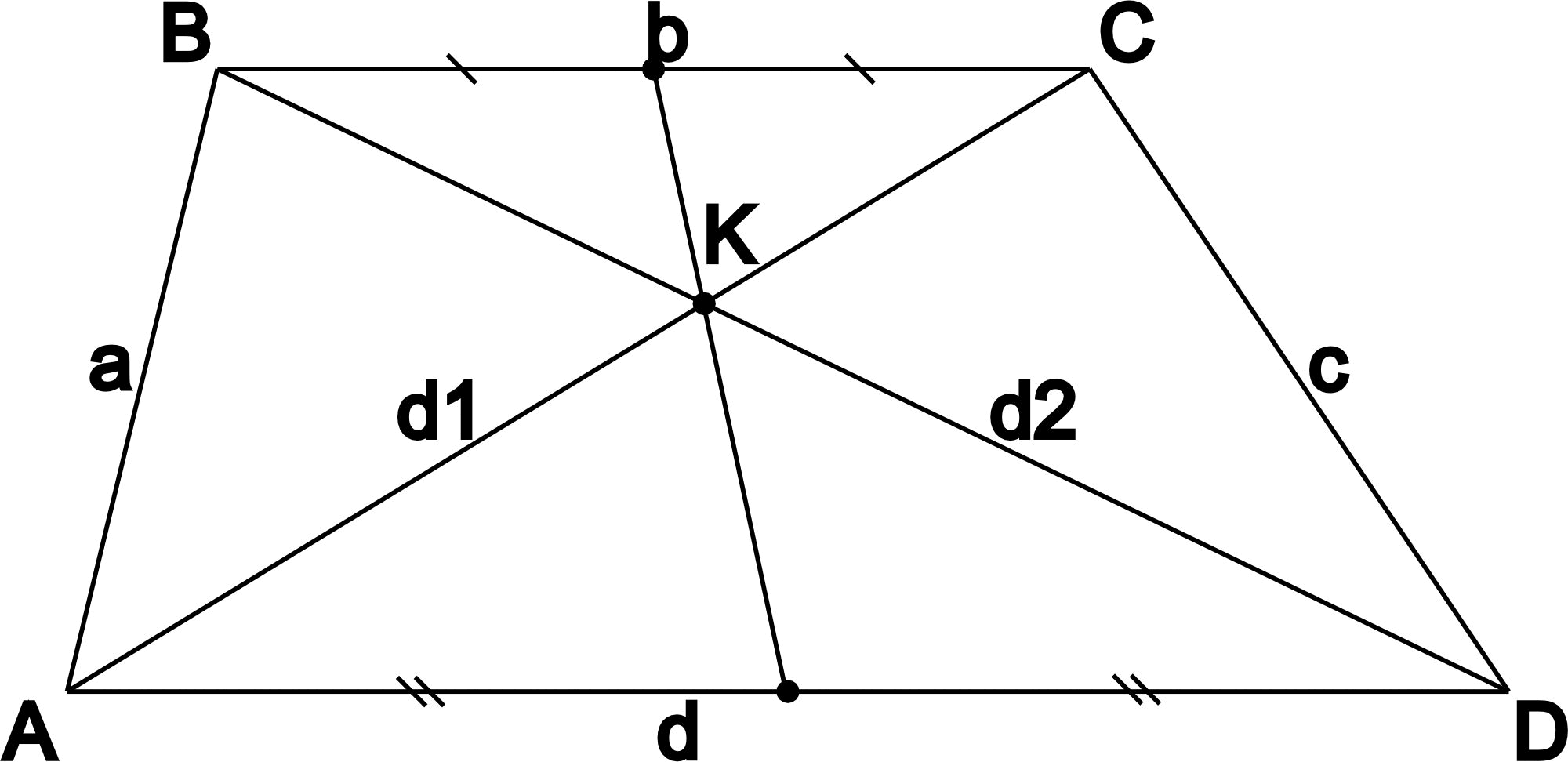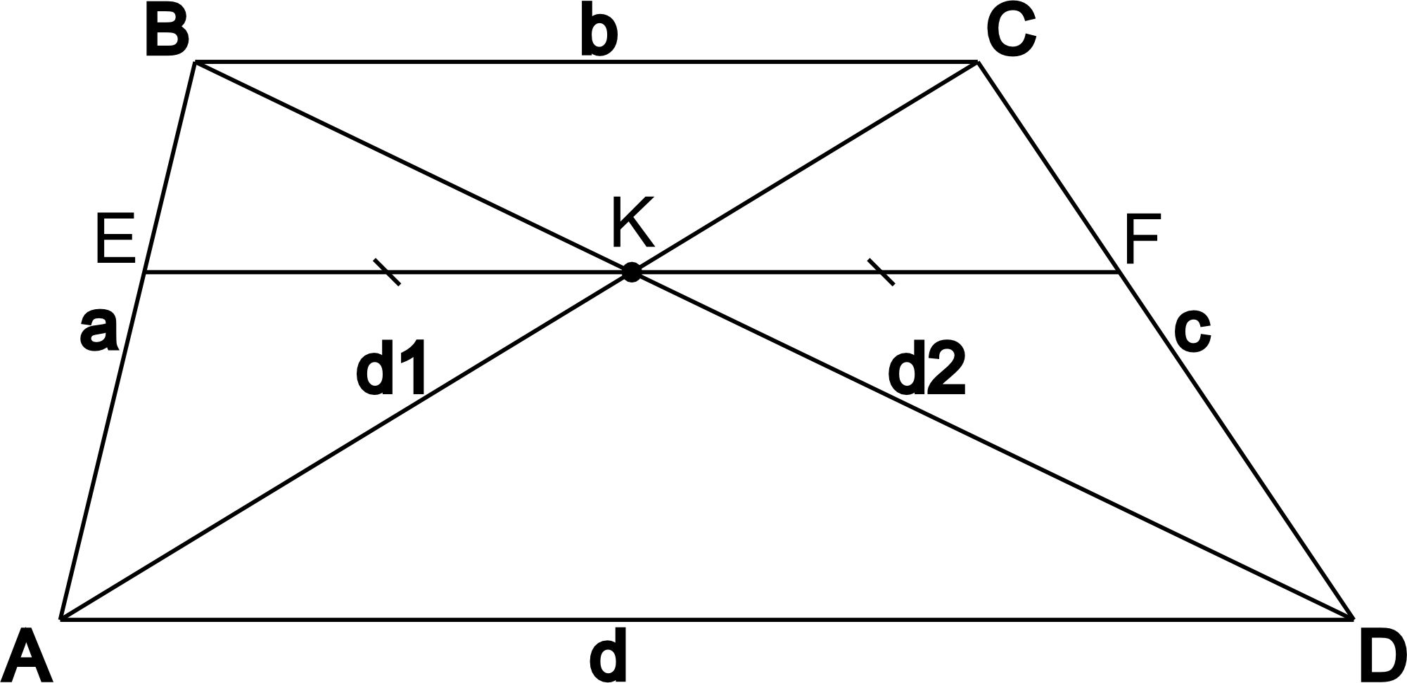 - Отрезок, проходящий через точку пересечения диагоналей параллельно основаниям, делится ею пополам: