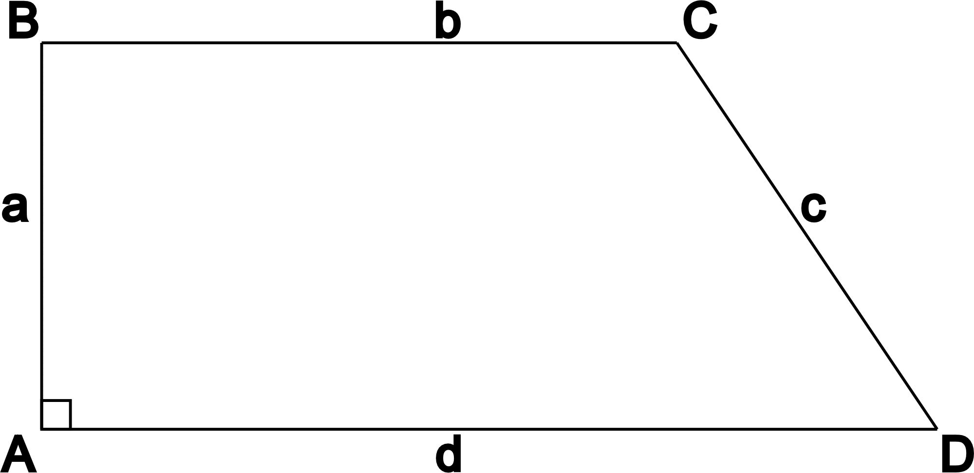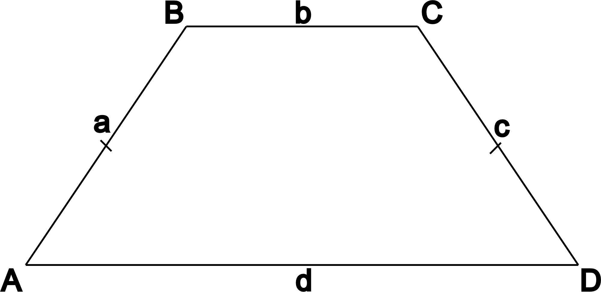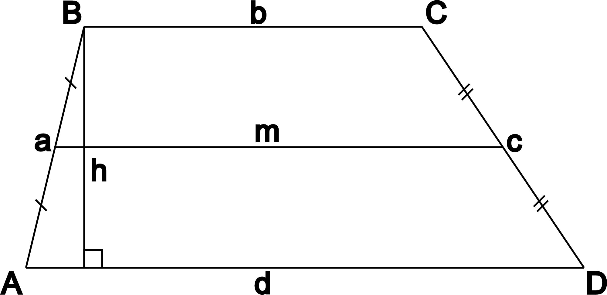 На рисунке a, b, c и d - стороны трапеции, A, B, C и D - углы трапеции, h- высота, m - средняя линия.