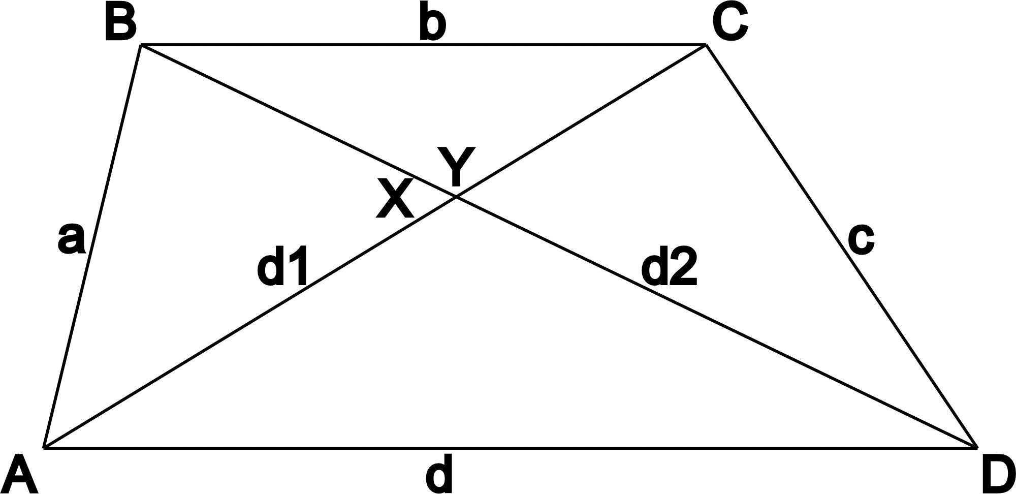 - Через длины диагоналей и средней линии и углы между диагоналями: