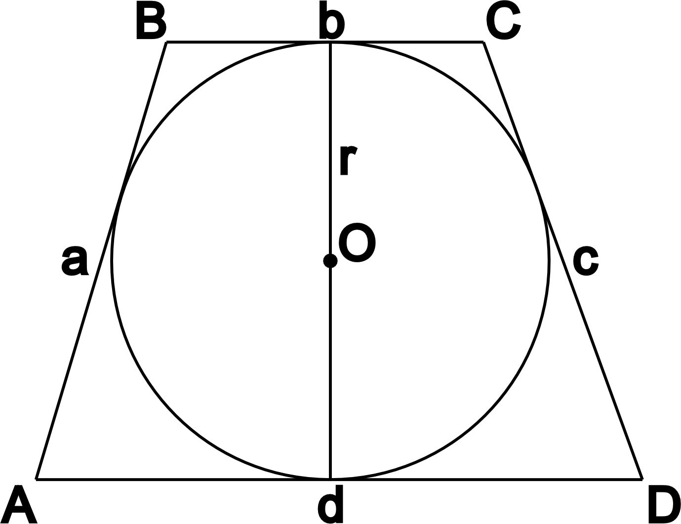 - В трапецию можно вписать окружность, если сумма длин её оснований равна сумме длин боковых сторон.